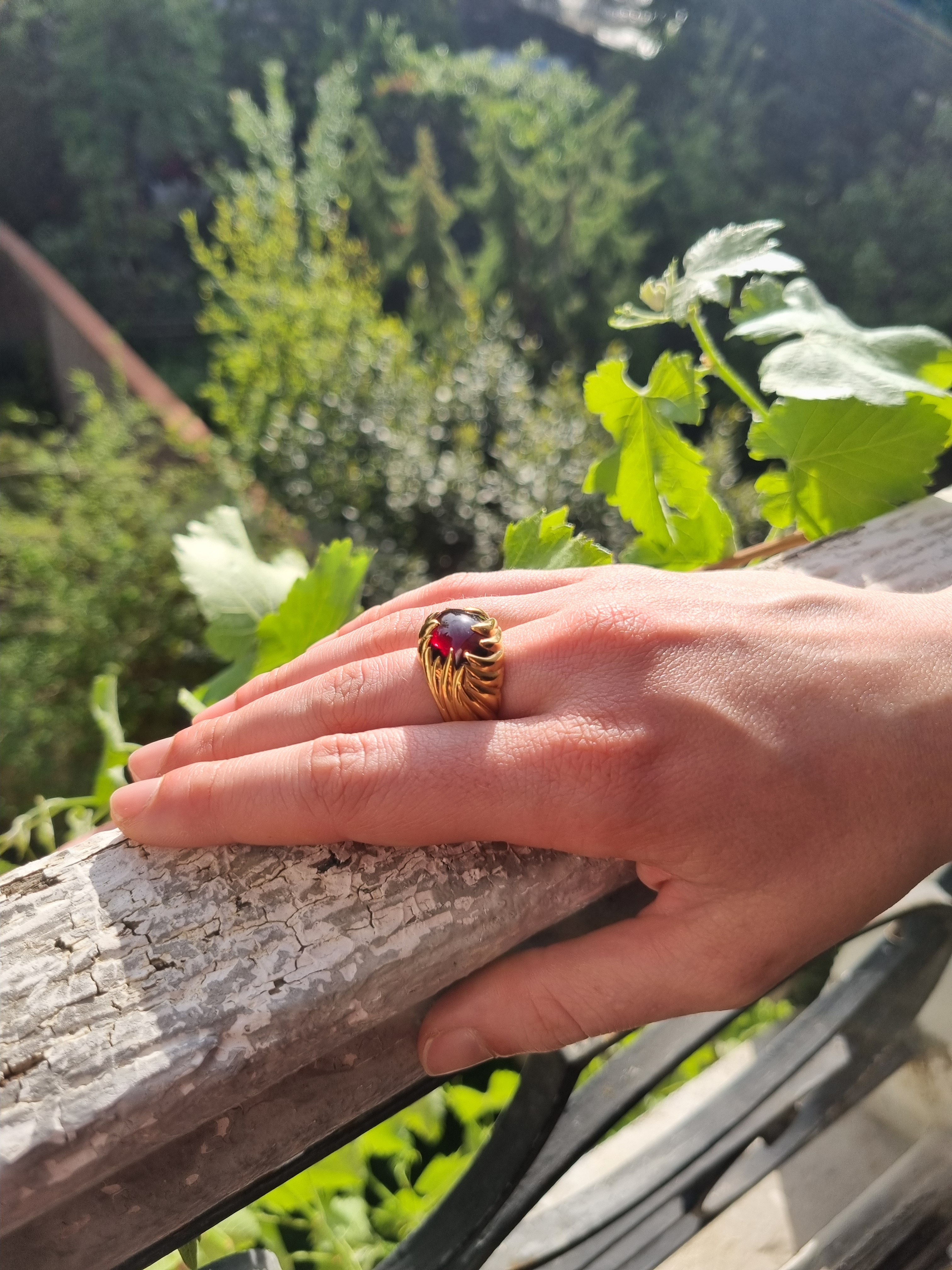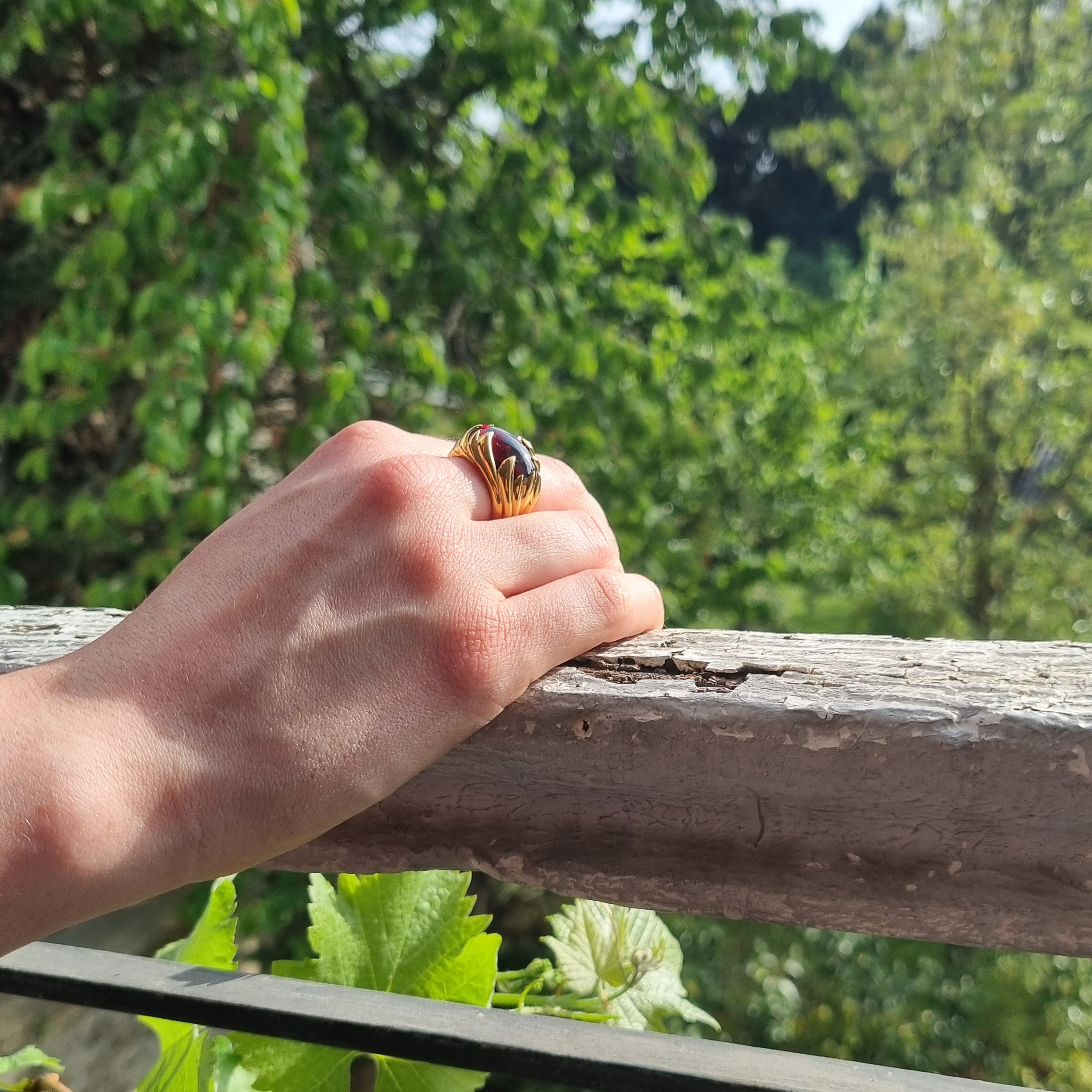 Cette bague en or avec un beau grenat évoque la lumière et la chaleur de la personne qui la porte. Les intenses nuances de rouges se révèlent sous les rayons du soleil.